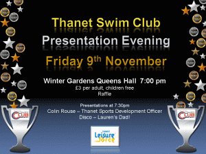 The Thanet Swim Club Presentation Evening has now been booked for 9th November 2012 in the Queen’s Hall at the Winter Gardens.