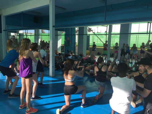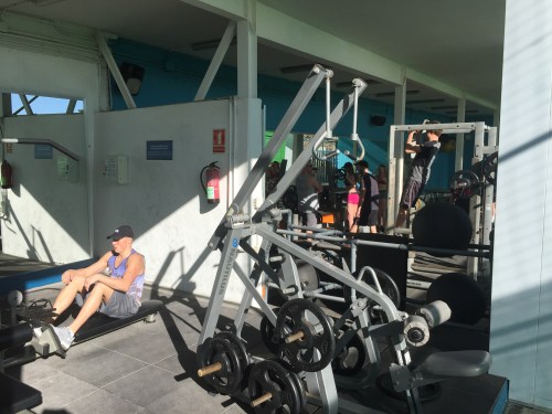 Back to the gym, where the group was split for some stretching and weights